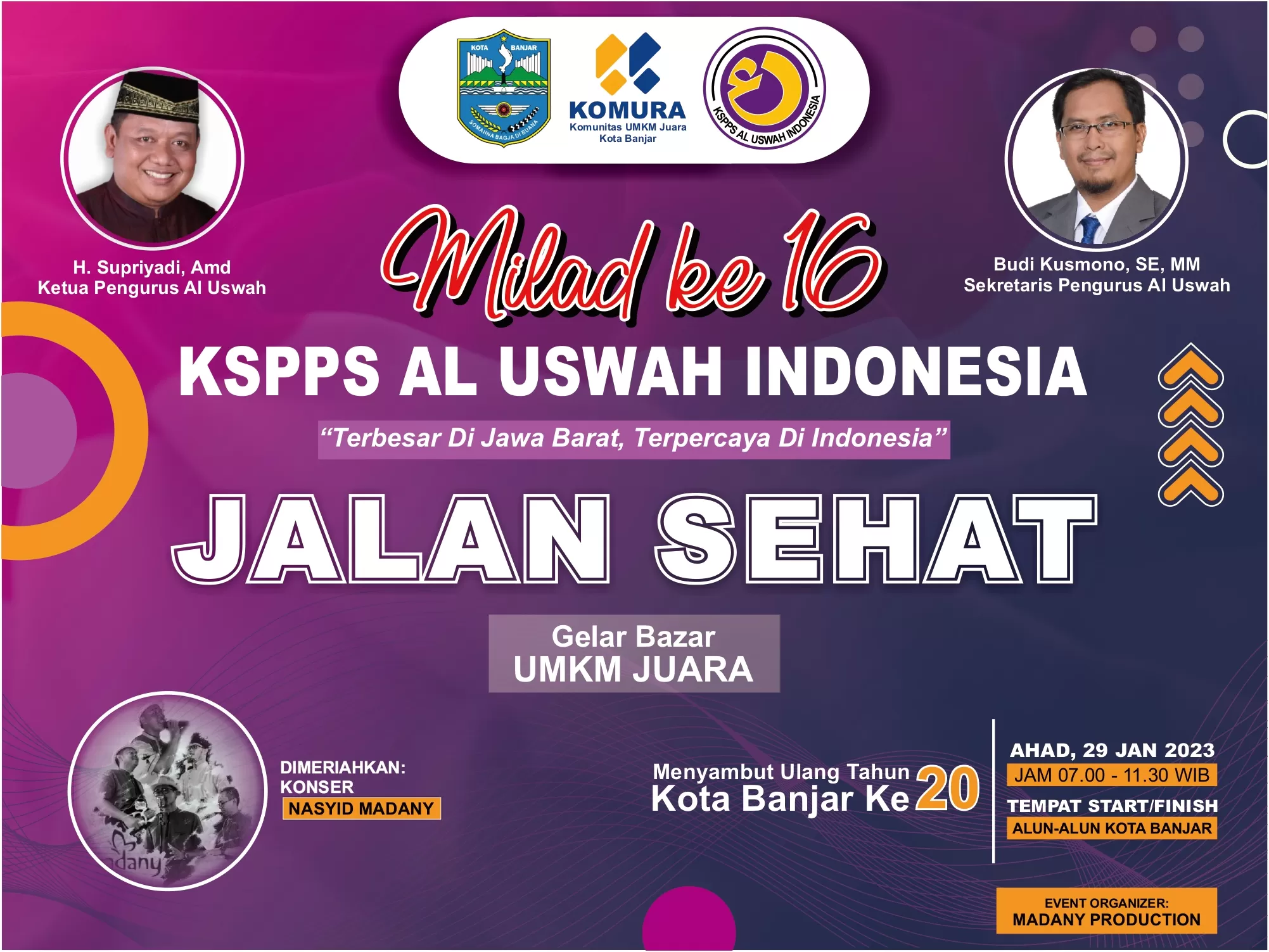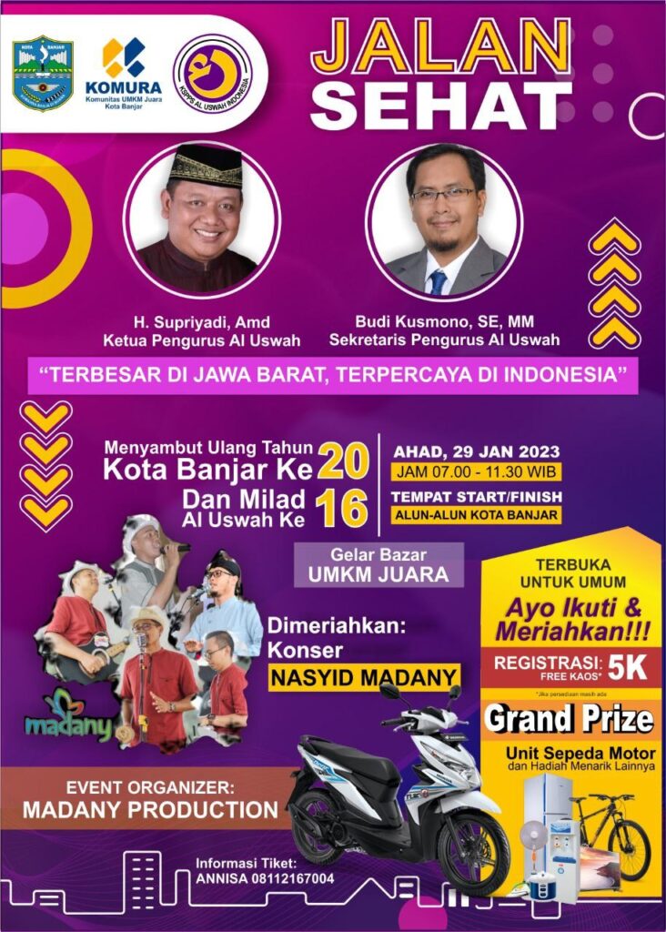 Dalam rangka memperingati Hari Ulang Tahun (Milad) yang Ke-16 tahun, KSPPS Al Uswah Indonesia akan menyelenggarakan kegiatan Jalan Sehat yang akan dilaksanakan di alun alun Kota Banjar pada hari Minggu 29/01/2023. Acara peringatan milad ke 16 Tahun ini juga bertepatan dengan acara menyambut HUT Kota Banjar yang ke 20 Tahun.